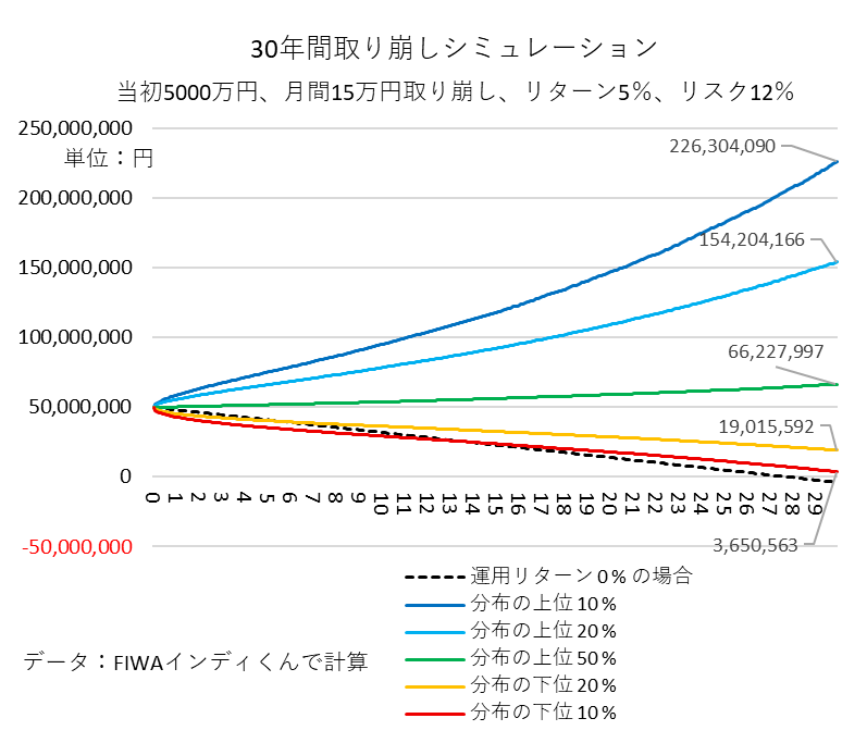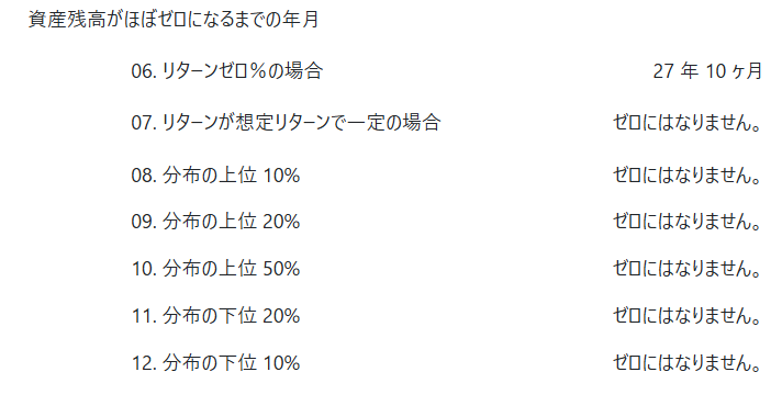 なんと幸運な場合の上から10%目では資産総額が2億2630万円に増えます。不運な下から10%目でも365万円の資産が残ります。運用リターンゼロ%の場合には27年10カ月でゼロになる場合と比べて、資産の寿命は遥かに伸びることがわかります。