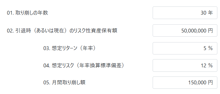 さて65歳以降毎月15万円金融資産を取り崩しながら年金と合わせて使うことにしましょう。余命は30年間と想定します。運用リターンゼロならば、27.8年(=5000/(15×12))(27年10カ月)で資産はなくなります。そこでリスクを抑制するためにリターンを5%程度まで落とし、リスク12%で運用を継続するとどうなるでしょうか?運用元本は毎月引き出す15万円分減少しますが、残りの残高は5%で運用を続けるわけです。